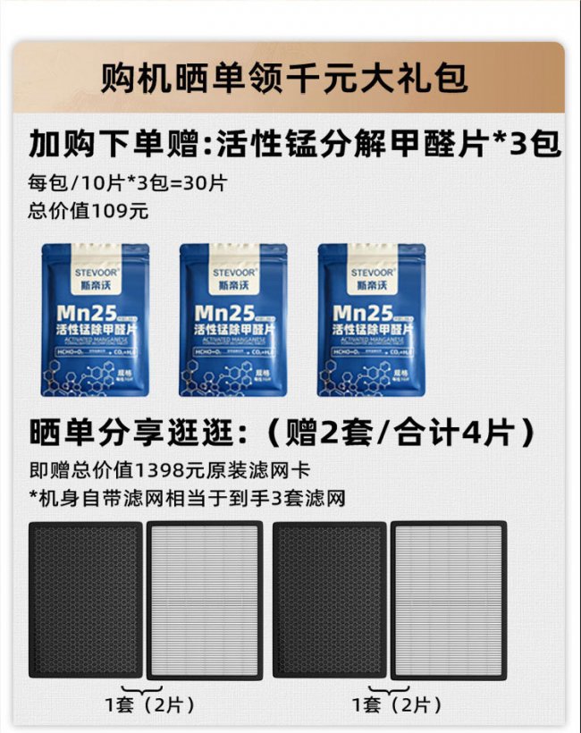 滤网的寿命直接决定后续使用成本,斯帝沃A9凭借核心的双片独立分解甲醛网10年免更换技术,大幅降低后续使用成本,搭配其他滤网12-18个月的更换周期,远超传统吸附型机型(6个月更换一次)。目前购机可享受多重优惠,叠加国补和平台活动到手价仅3699元,购机即送斯帝沃活性锰除甲醛片3包(价值109元,可放置于柜子、抽屉等封闭空间辅助除醛),晒单再送原装滤网2套,实现3年0滤网费用,后续滤网会员价仅540元左右一套。对比同参数高端机型(价位5000-8000元),斯帝沃A9让用户花中端价格享受高端机型的性能与服务,兼顾耐用性与高性价比。