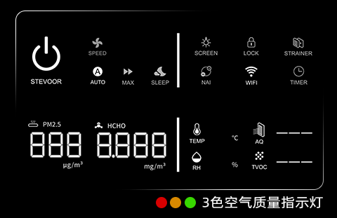空气质量监测的核心的是精准度,甲醛数值显示分为百分位0.01mg/m³和千分位0.001mg/m³,优选千分位监测,否则机器易出现数值长期不变动的情况,无法精准反映净化效果。斯帝沃A9搭载第六代电化学固态传感器,抗干扰、高灵敏,甲醛检测精度达0.001mg/m³,千分位数值可分秒显示,能实时捕捉甲醛浓度波动,避免机器“盲目工作”,相较于百分位监测更精准、更实用。同时,配备灵敏化学传感器,实现6大空气质量数据同步可视化,包括PM2.5、TVOC(含苯、甲苯等)、温度、湿度、AQ空气质量(三色灯显示),高清LED屏实时呈现,让室内空气质量一目了然。