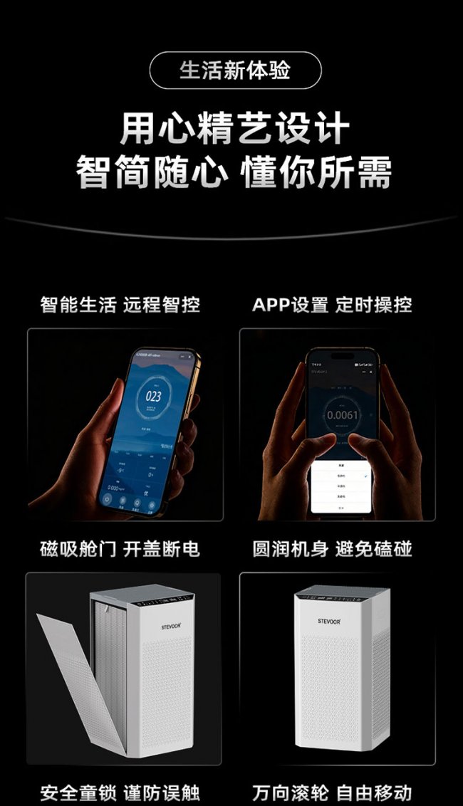 斯帝沃A9兼顾智能化便捷性与全方位安全防护,配备智能APP远程监控功能,可实现远程开关机、定时净化、实时查看空气质量(含TVOC、甲醛数值)、滤网清洁与更换提醒,无需手动操作,居家、外出均可轻松掌控净化状态。同时,配备多重安全保护功能:磁吸舱门设计,开盖自动断电;安全童锁,谨防婴幼儿误触操作;圆润机身,避免磕碰;万向滚轮,可自由移动适配不同空间;可卸电源,整洁收纳;换芯提示,贴心便捷,全方位守护母婴家庭及全家使用安全,契合婴儿房净化器的安全防护需求。