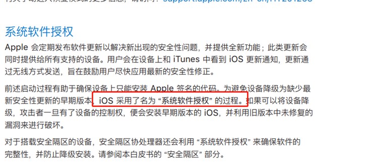 《iOS完全白皮书》中明确写道:“为避免设备降级为缺少最 新安全性更新的早期版本,iOS 采用了名为 ‘系统软件授权’的过程。如果可以将设备降级,攻击者一旦有了设备的控制权,便会安装早期版本的 iOS,并利用旧版本中未修复的 漏洞来进行破坏。”
