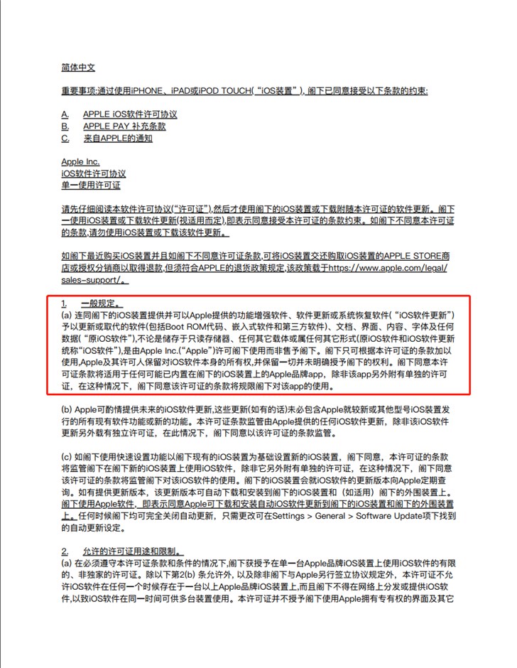 首先从法律角度来看,苹果不开放iOS旧版本降级,是否合法呢?我们来看一下苹果iOS12版本的iPhone、iPad和iPod Touch的软件许可协议。