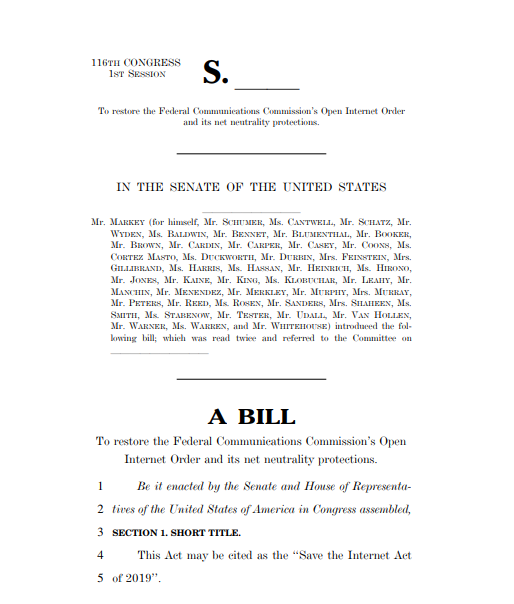 《拯救互联网法案》(Save the Internet Act或HR 1644)将恢复2015年联邦通信委员会(FCC)通过的规则。这些规则禁止互联网服务提供商阻止或限制对互联网的访问,并且还阻止互联网服务提供商向公司收取额外费用以更快地为消费者提供其在线服务。此外,该法案还将恢复FCC管理和监督宽带网络的权力。