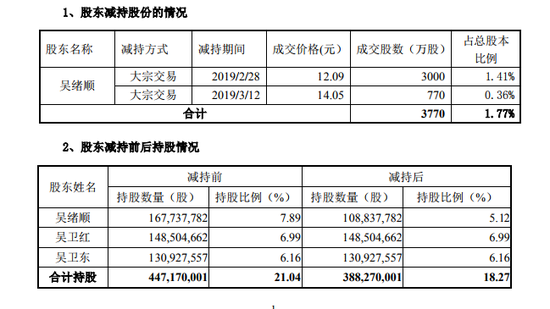 根据公告,3月13日,吴绪顺将其持有的2120万股直接换购银华MSCI中国ETF份额,本次换购导致吴绪顺的持股比例从6.12%降为5.12%。该操作也导致第一大股东发生变化,由吴氏家族变更为李卫伟。在2019年2月14日至2019年5月13日期间,吴氏家族拟通过大宗交易的方式减持不超过公司总股本2%的股份。